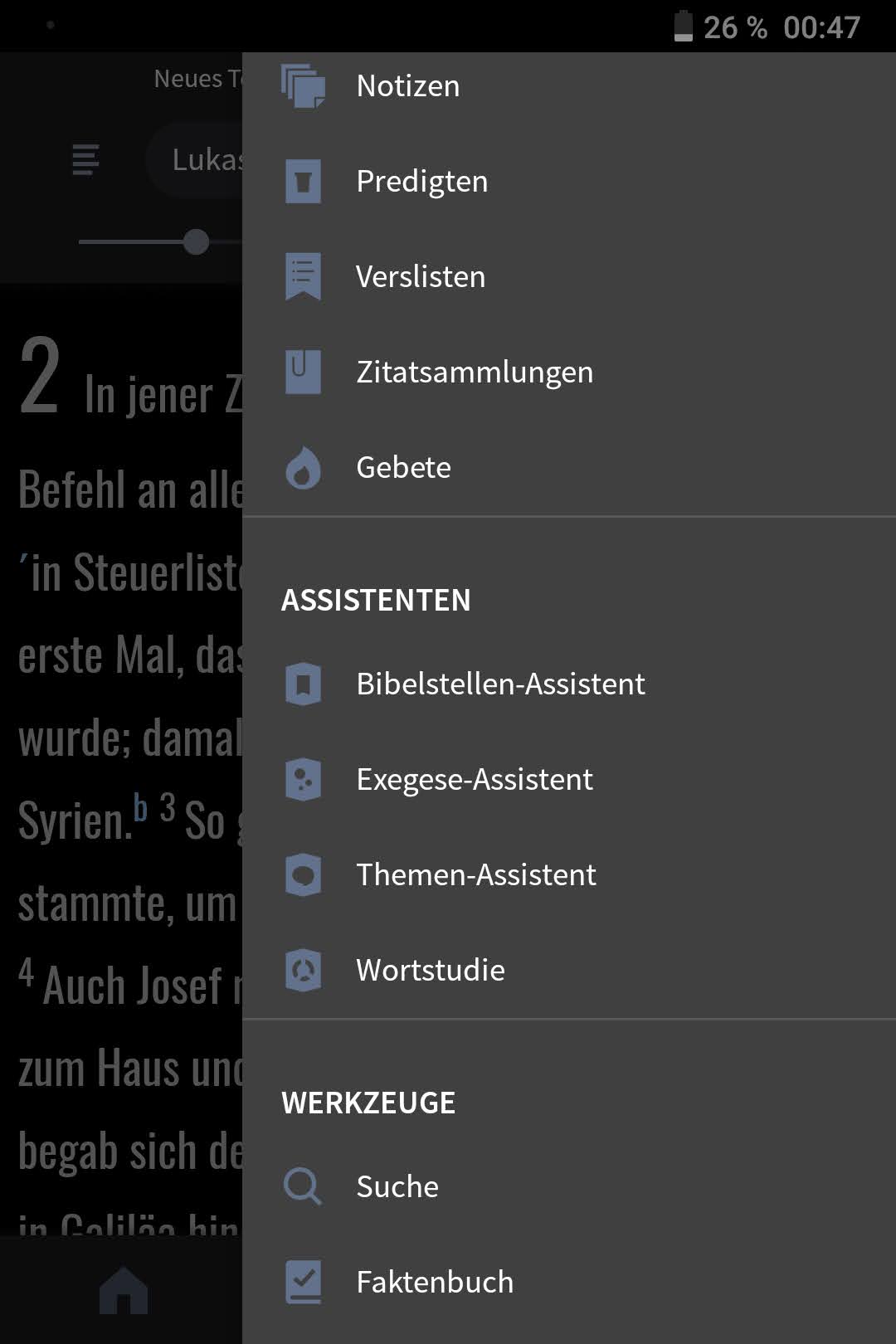 Mittlerweile gibt es eine stattliche Auswahl deutscher Literatur, die sich sehen lassen kann. Dark Mode und Predigtwerkzeuge sind für mich neben dem verbesserten Faktenbuch die großen Punkte, die mit der neuen Version herausstechen.